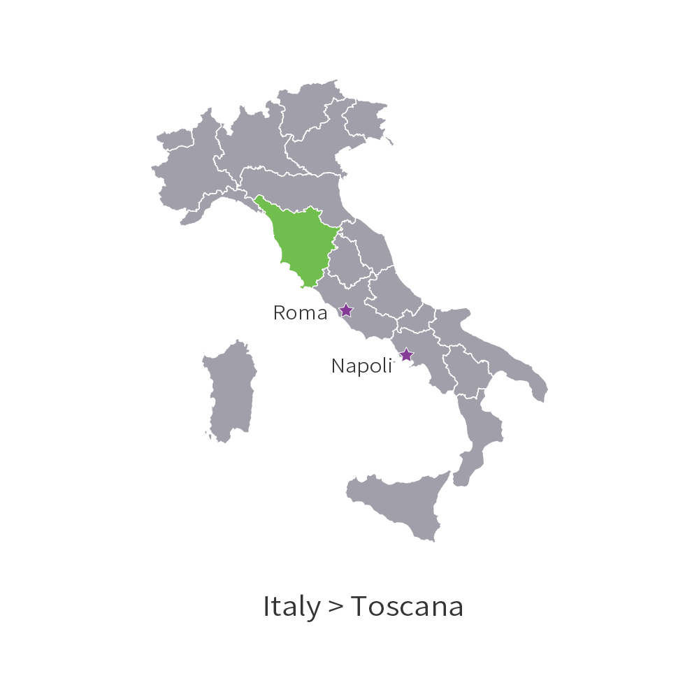 토스카나는 이탈리아 중부에 위치한 주로 피렌체가 주도이며, 티레니아 해(Tyrrhenian Sea)에 접해 있습니다. 토스카나 와인은 로마인보다 앞서 이탈리아반도에 최초로 독자적인 문화를 남긴 에트루리아인(Etruscans)에 의하여 시작되었습니다. 기원전 7세기부터 3세기까지 에트루리아인이 토스카나에서 와인을 생산하여 수출했다는 기록이 있습니다.